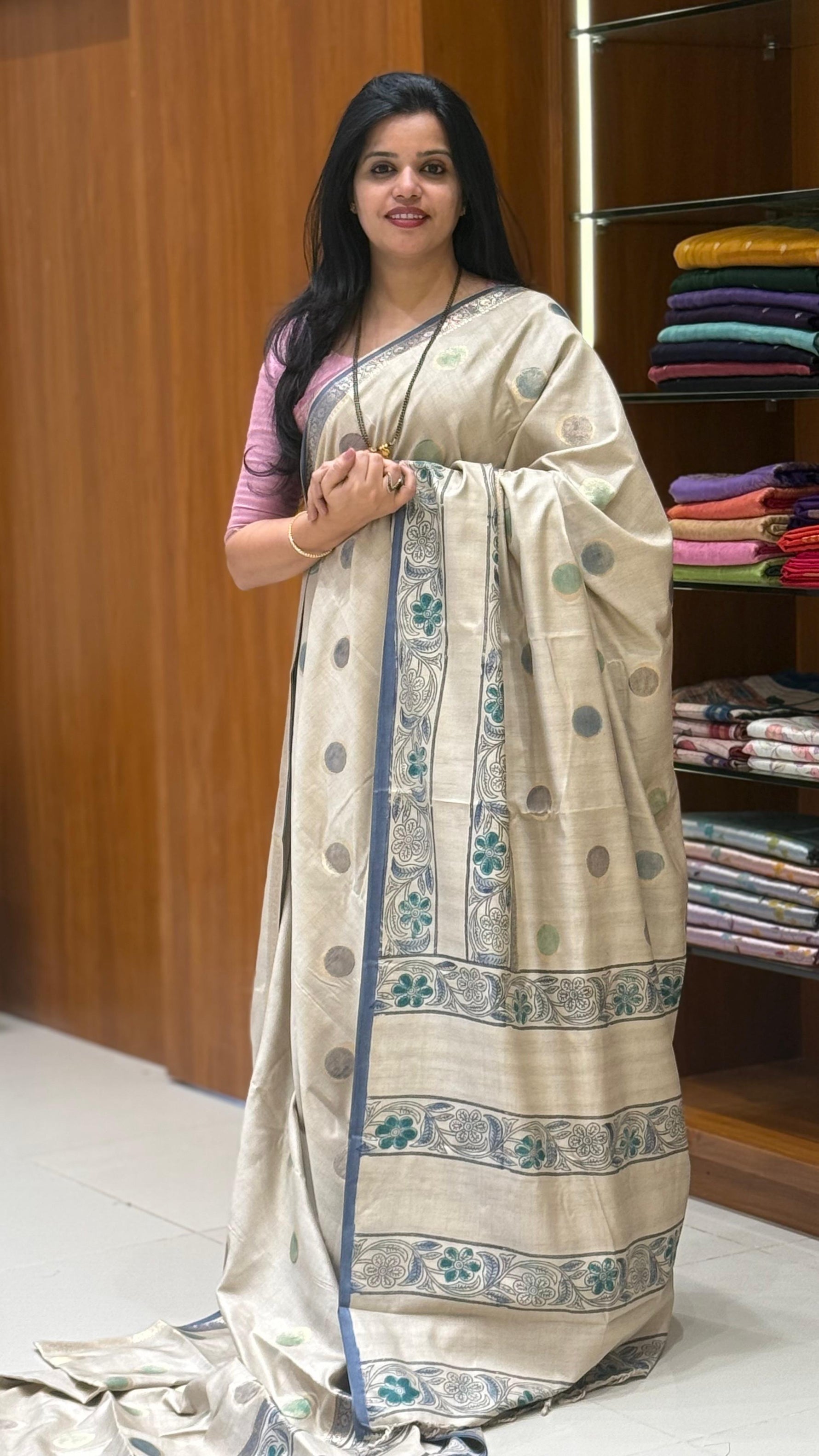 FABRIC:  Viscose Tusser saree with kalamkari highlights with prints highlighted with brush paints!