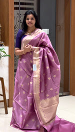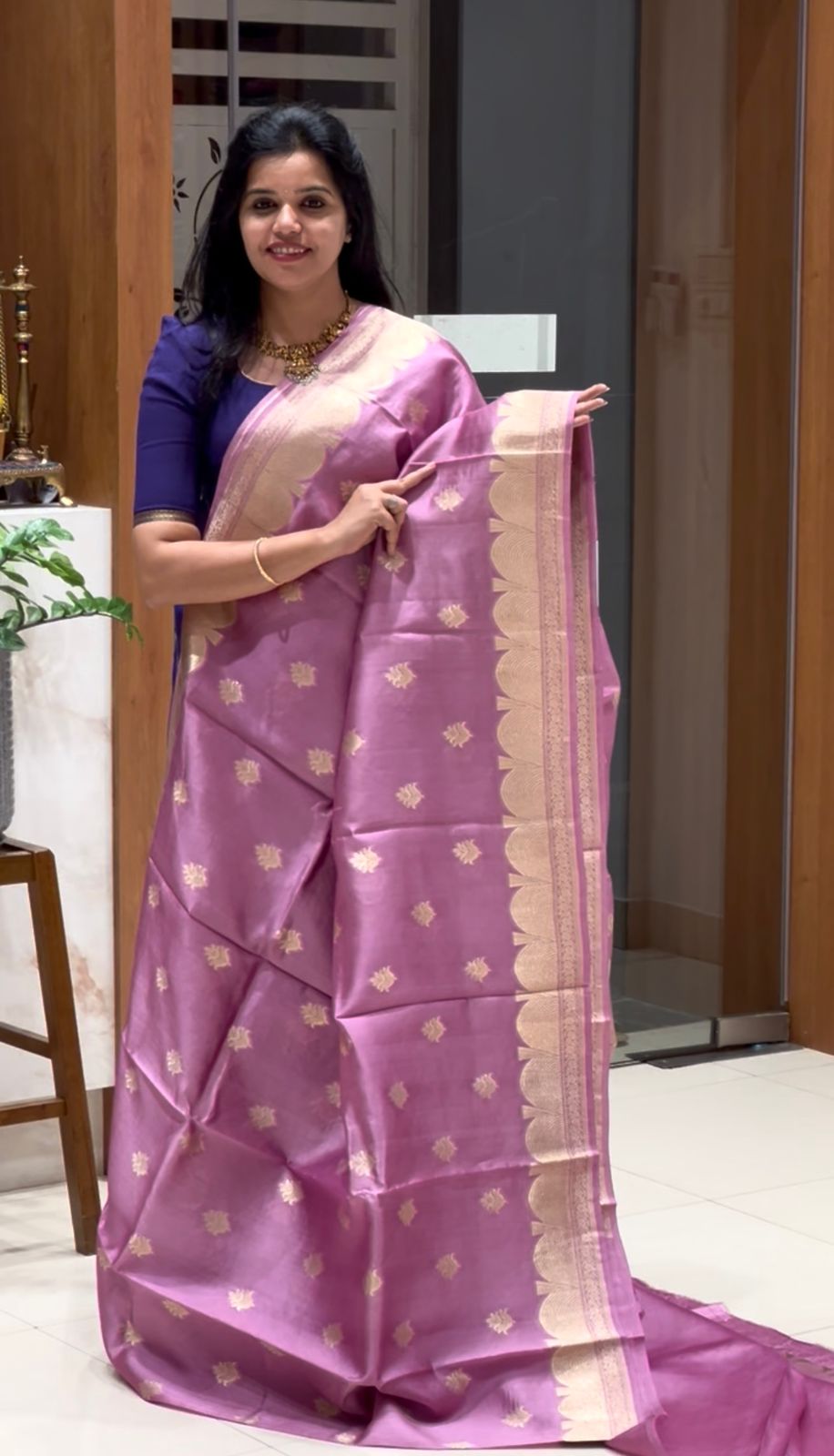 Small zari buttas (motifs) are woven throughout the saree body, adding elegance and richness.