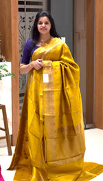 Small zari buttas (motifs) are woven throughout the saree body, adding elegance and richness.