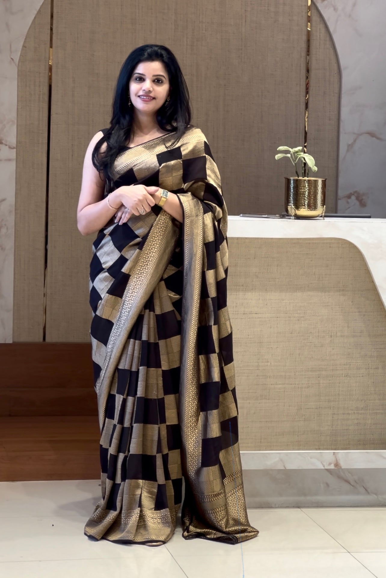 Make a bold statement with this contemporary yet traditional black and gold viscose georgette saree. Featuring a striking checkered pattern in zari weave, this saree perfectly blends classic design with a modern edge. The soft viscose georgette drapes beautifully, offering comfort with a touch of glam. Finished with a detailed gold zari border, it’s a stunning pick for evening occasions and festive celebrations.