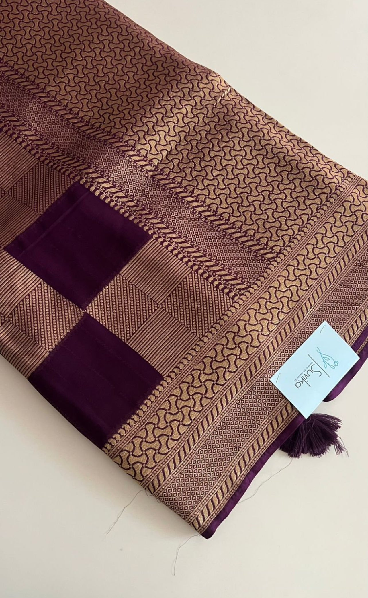 Make a bold statement with this contemporary yet traditional black and gold viscose georgette saree. Featuring a striking checkered pattern in zari weave, this saree perfectly blends classic design with a modern edge. The soft viscose georgette drapes beautifully, offering comfort with a touch of glam. Finished with a detailed gold zari border, it’s a stunning pick for evening occasions and festive celebrations.
