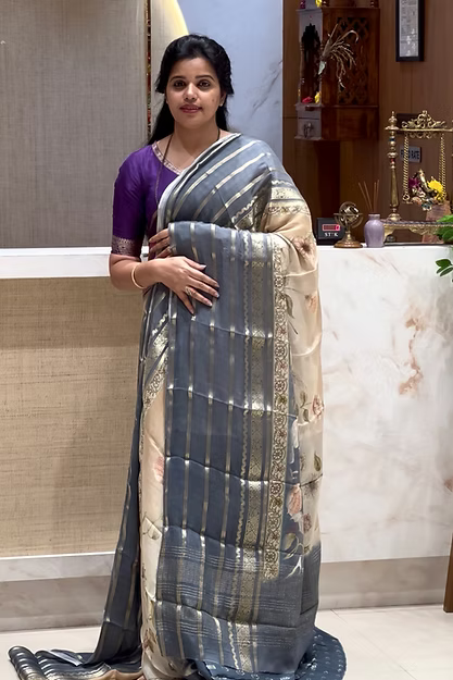 Pure viscose Chinnon saree with digital prints with a beautiful contrast borders