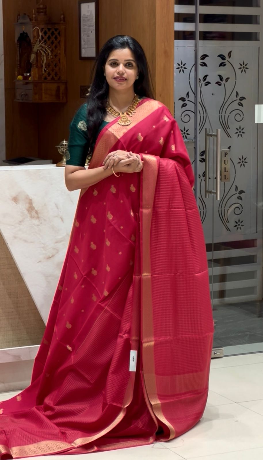 The saree body features tiny checks (kattam weave) interspersed with buttas (small gold motifs) woven in pure zari.