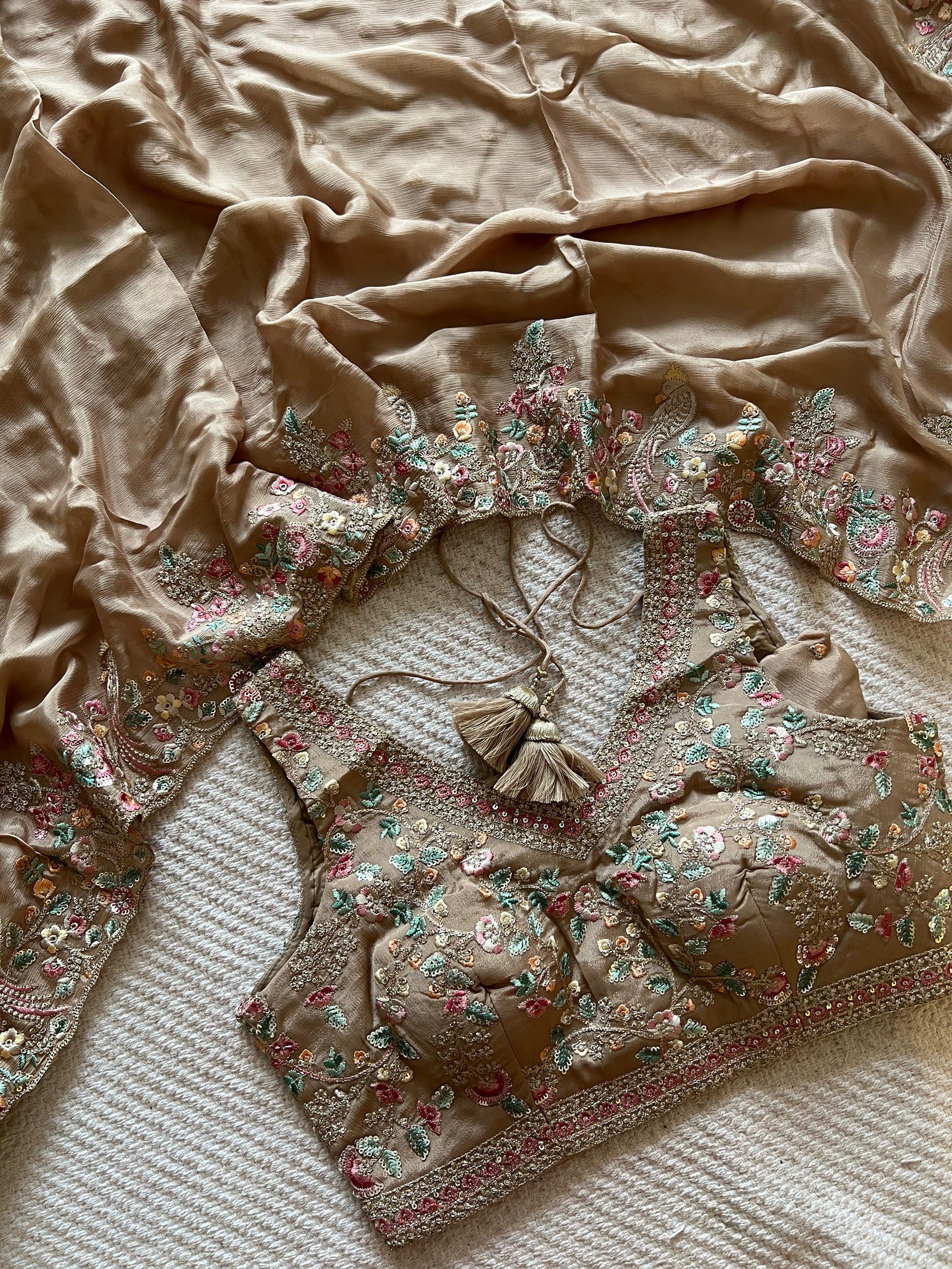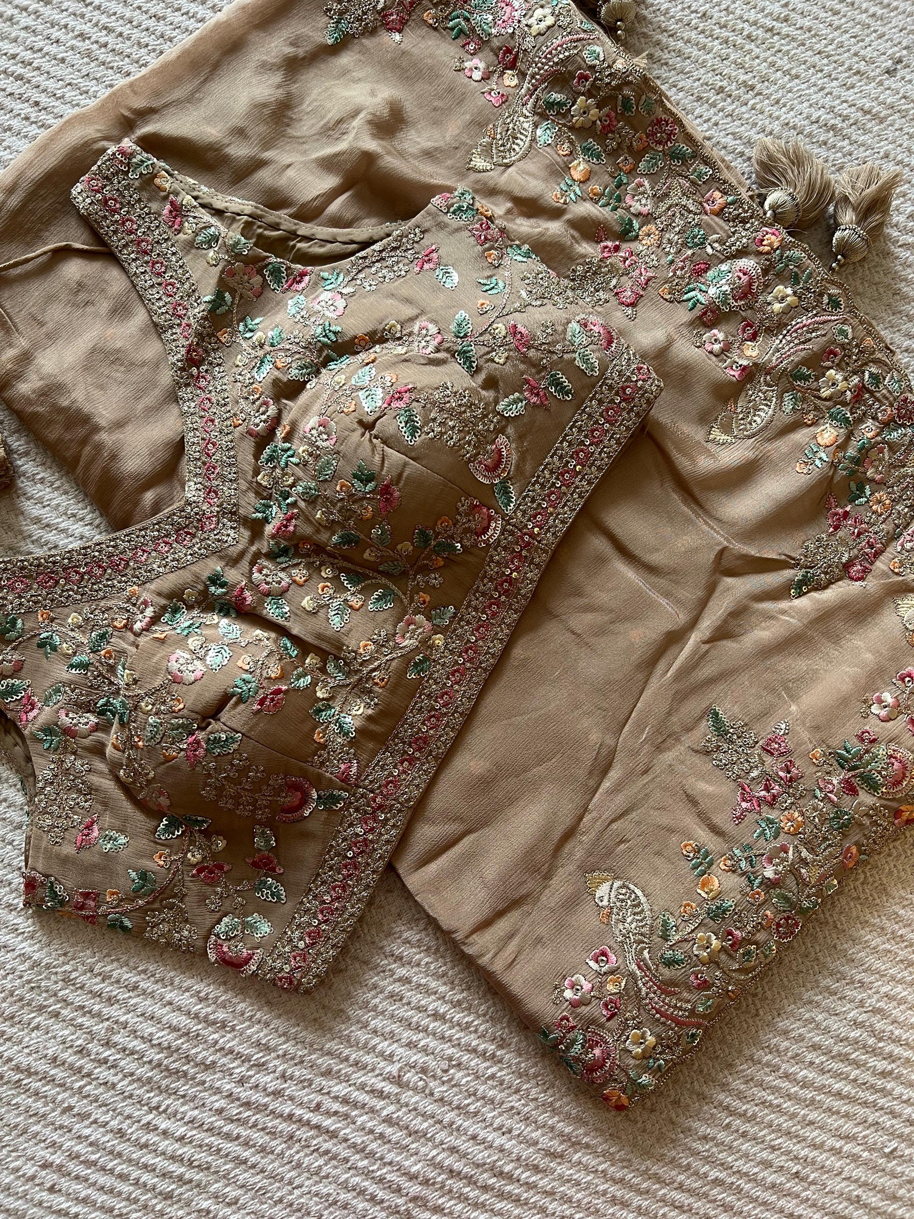 BLOUSE :  GEORGETTE BLOUSE WITH EMBROIDERY, BLOUSE SIZE 38( CAN BE ALTERED UPTO 40)