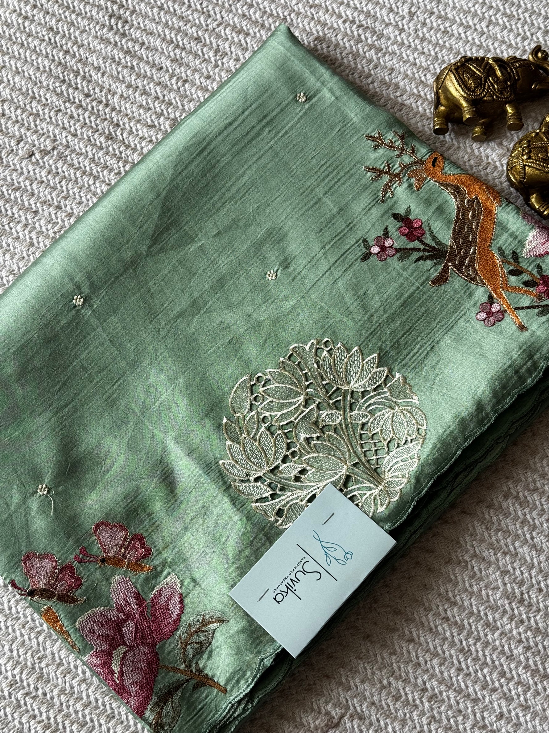 Viscose tusser silk saree with embroidery butta all over the body an embroidery border and pallu