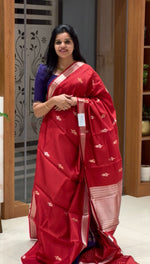 Small Silver zari buttas (motifs) are woven throughout the saree body, adding elegance and richness.