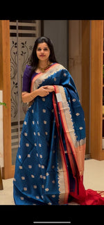 Small zari buttas (motifs) are woven throughout the saree body, adding elegance and richness.