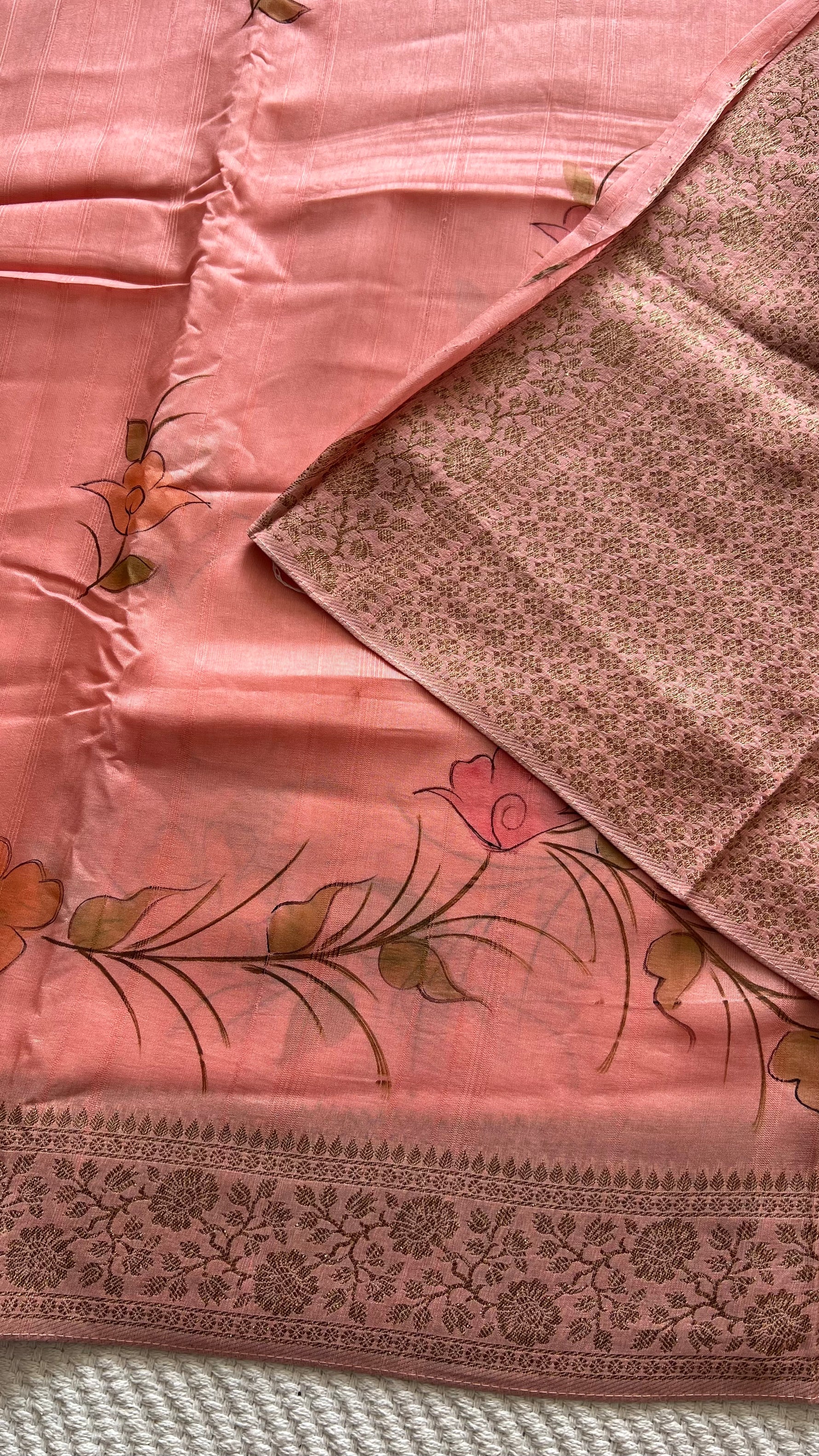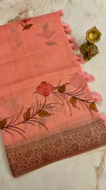 FABRIC: Tusser Georgette with floral printed on the body with antique zari border and pallu