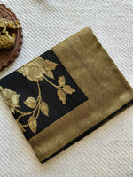A timeless saree adorned with antique woven Zari with florals , adding a touch of charm and classy look ! A designer effortless draping crepe saree with running blouse !