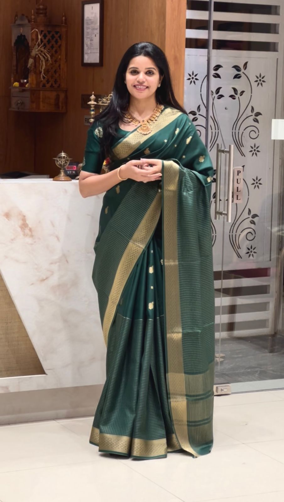 The saree body features tiny checks (kattam weave) interspersed with buttas (small gold motifs) woven in pure zari.