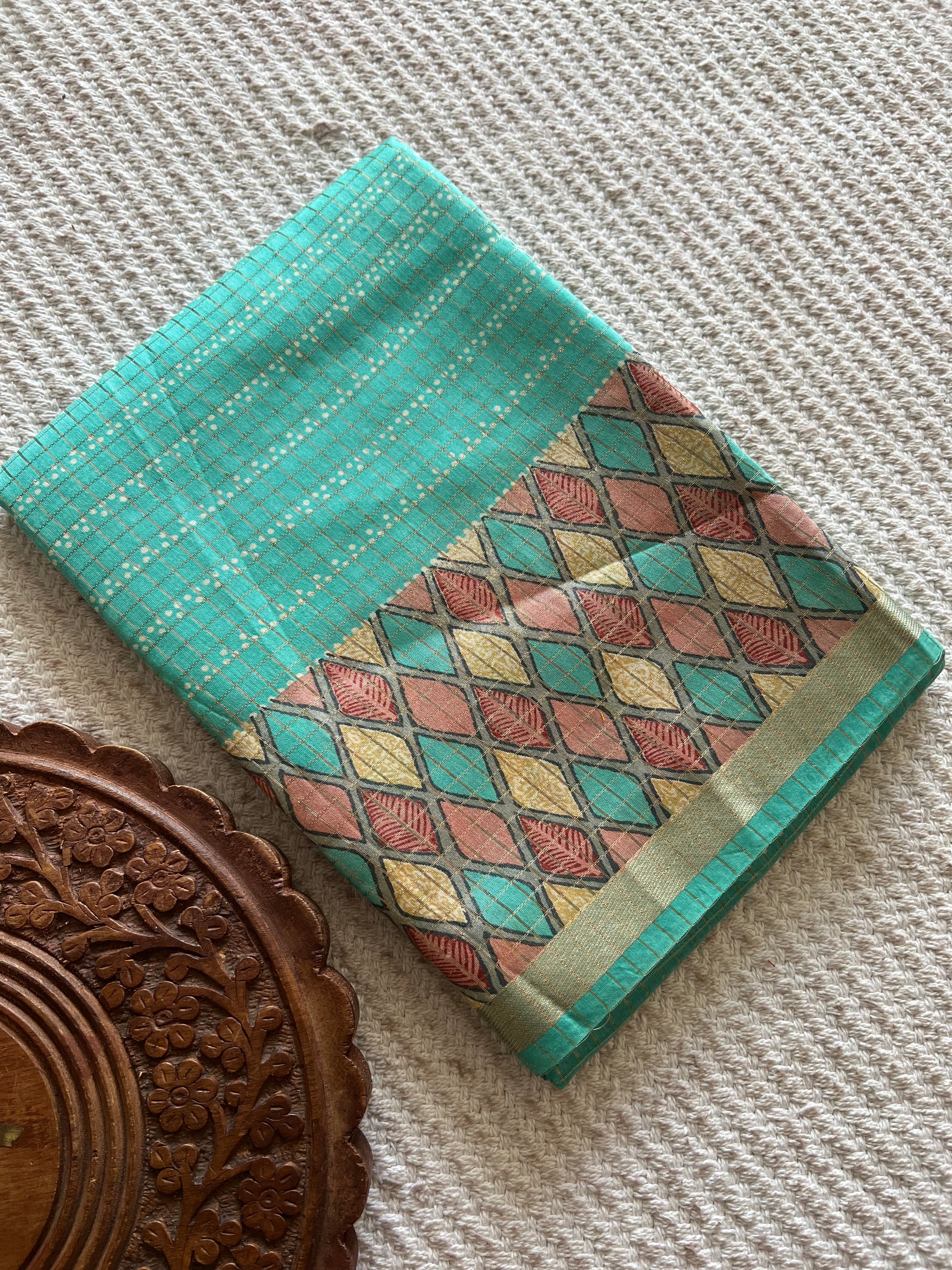 Viscose cotton silk sarees with prints on the body with contrast printed border teamed with contrast blouse !