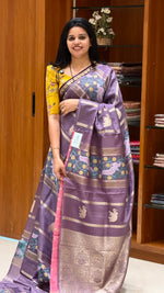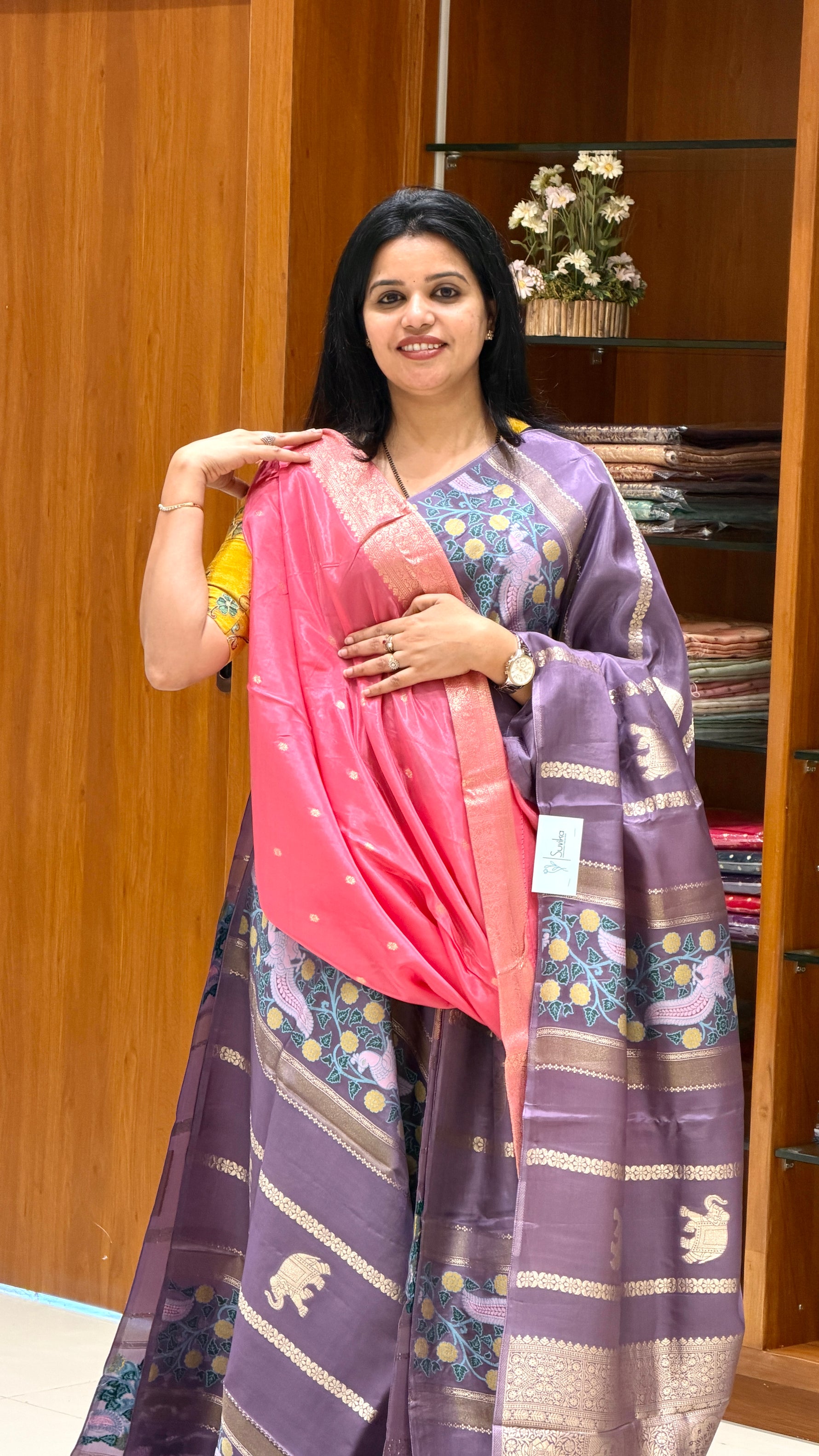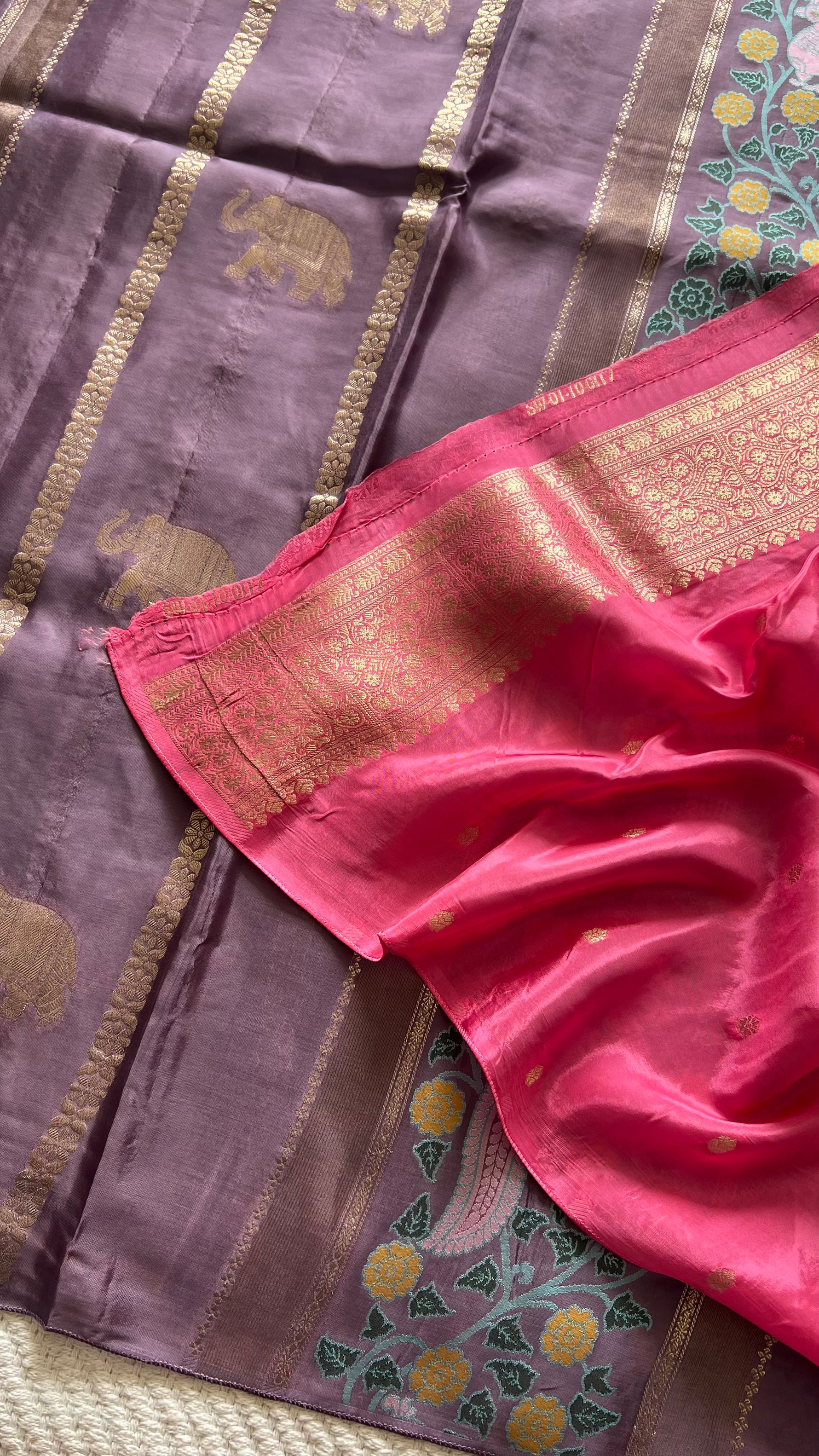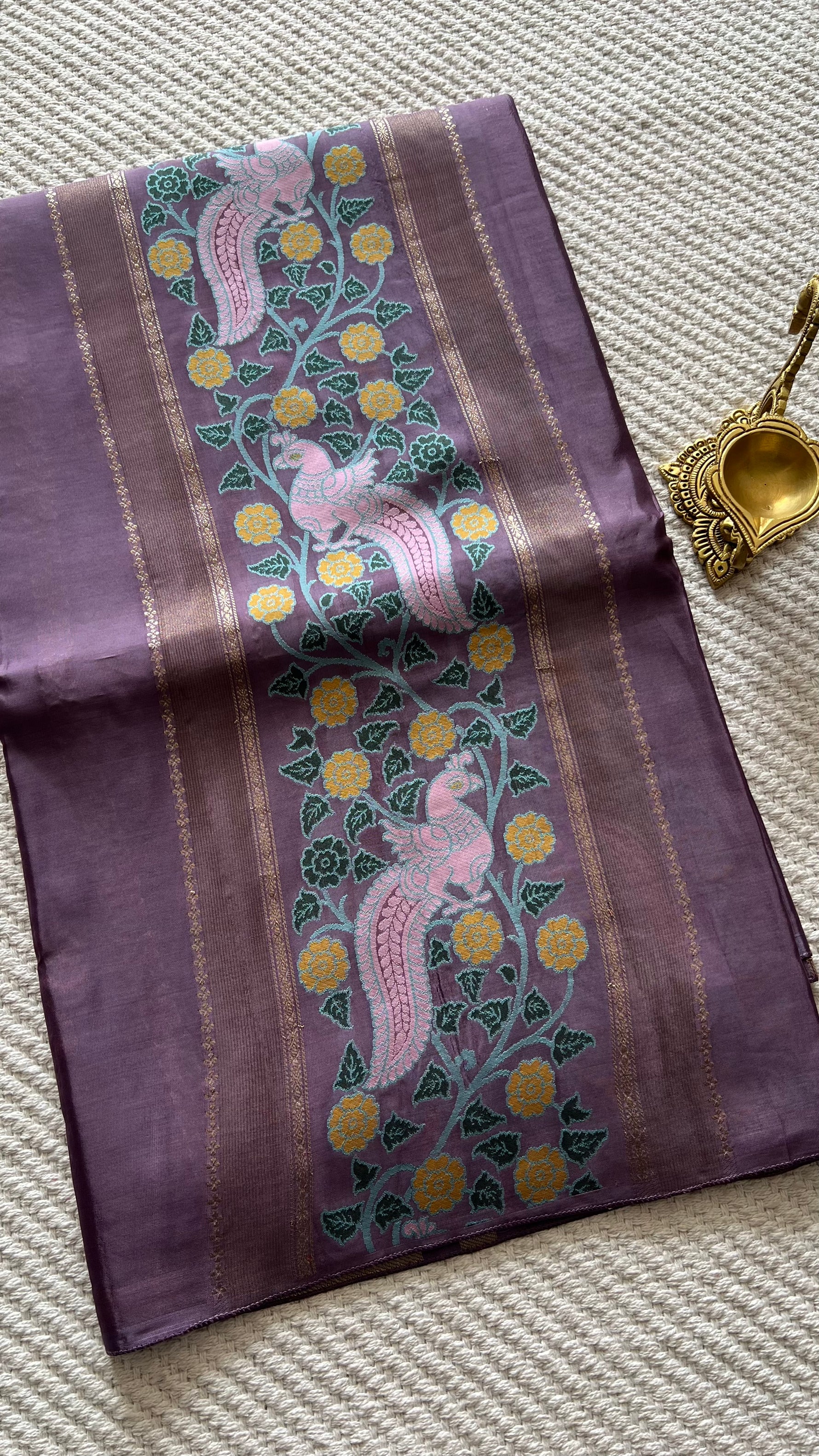 Chiniya silk saree with Woven zari motifs in gold elephants, Pashmina weaving and rich pallu