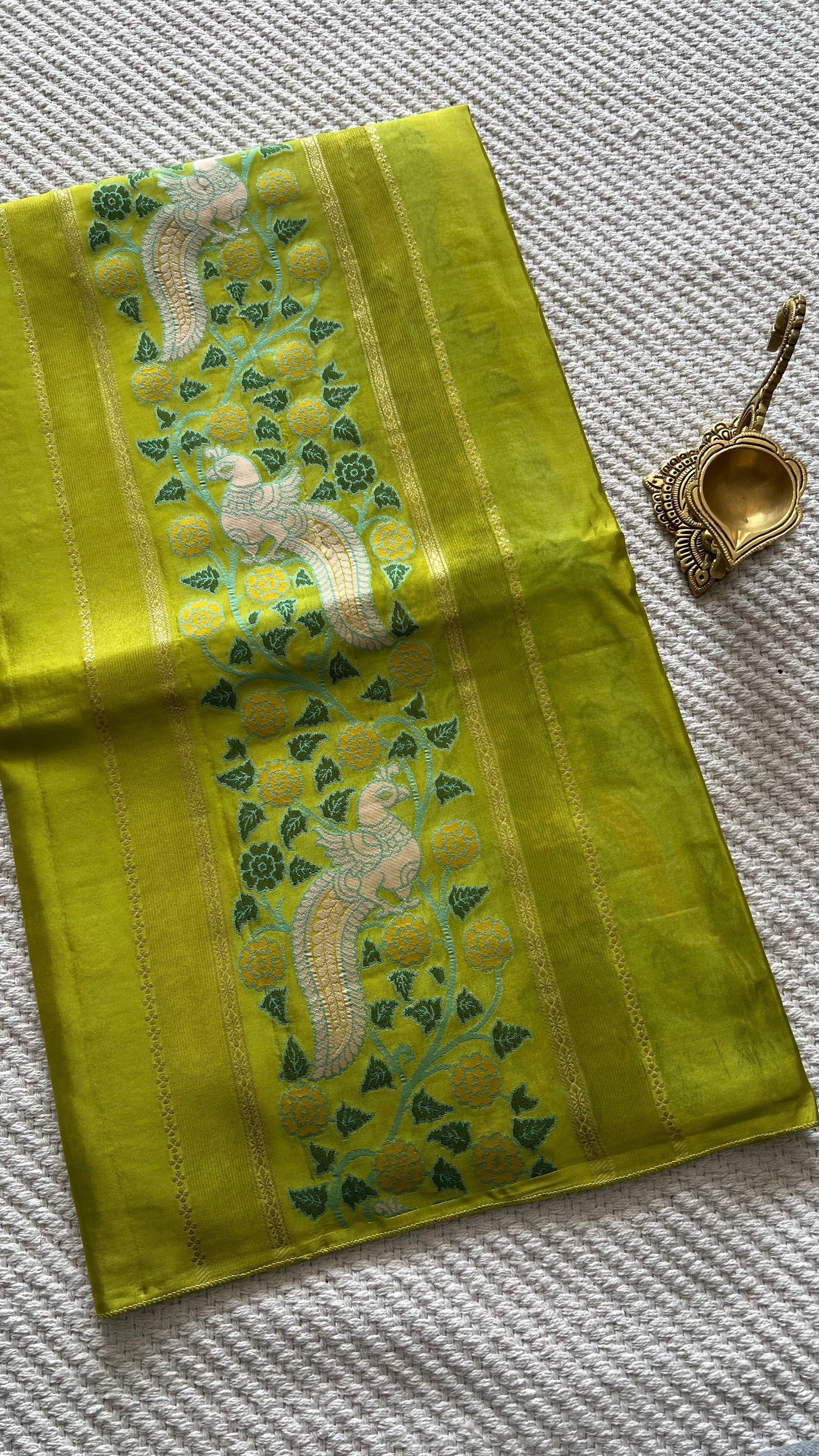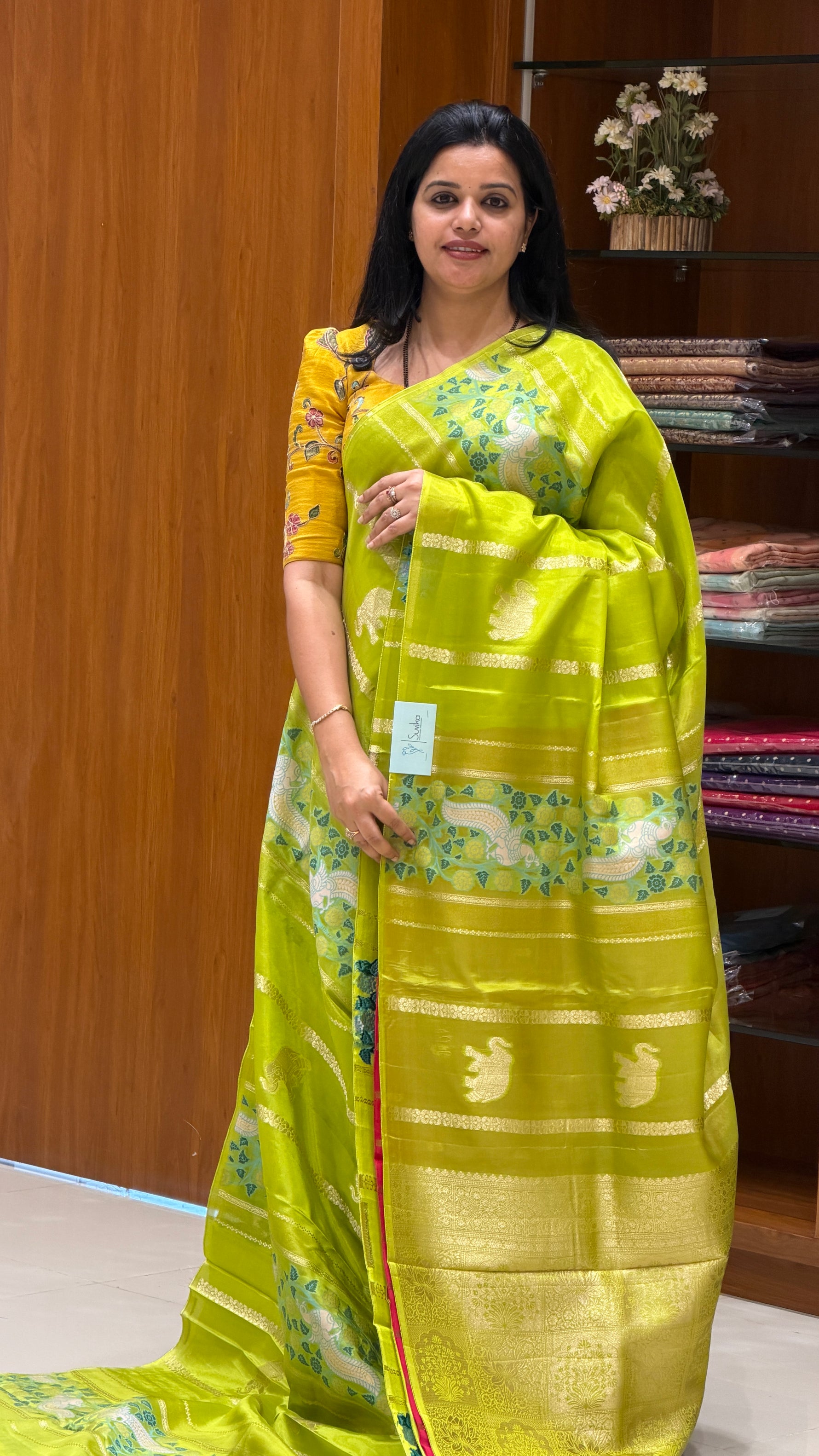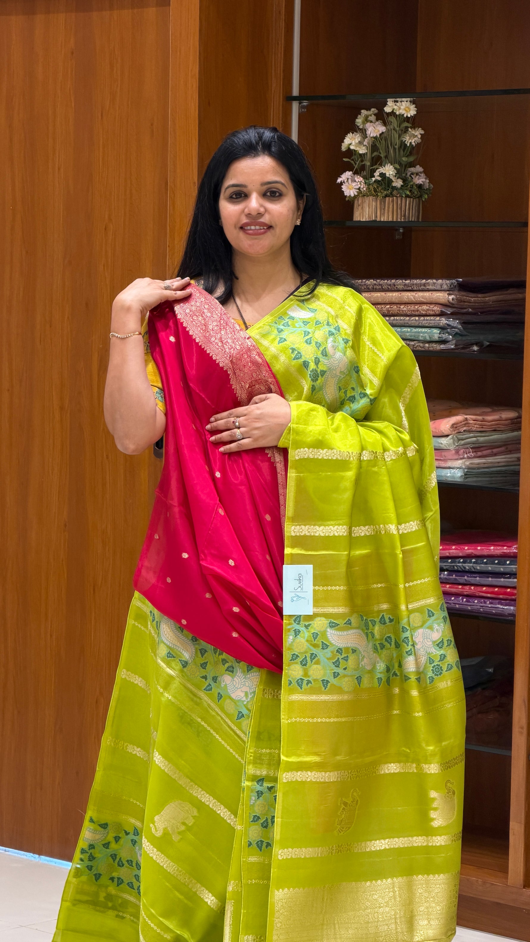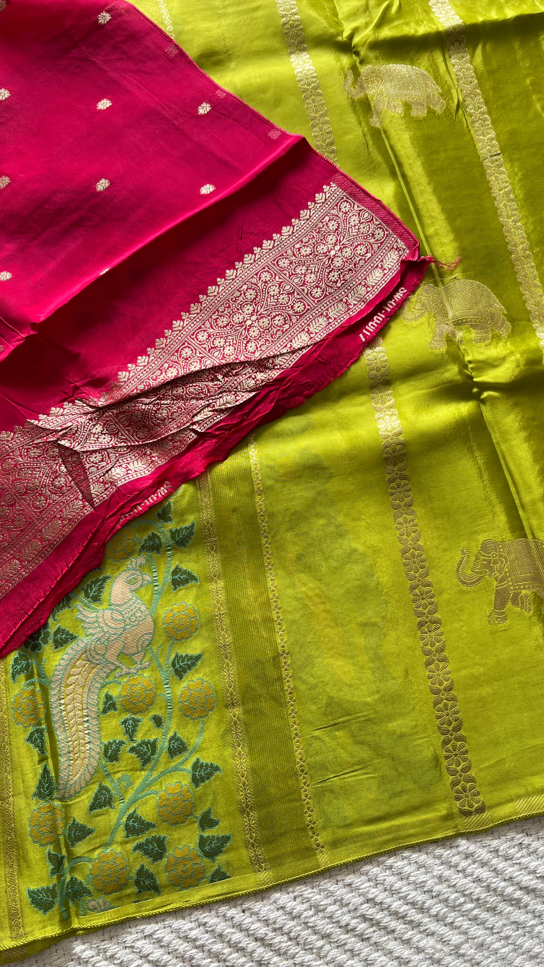 Chiniya silk saree with Woven zari motifs in gold elephants, Pashmina weaving and rich pallu