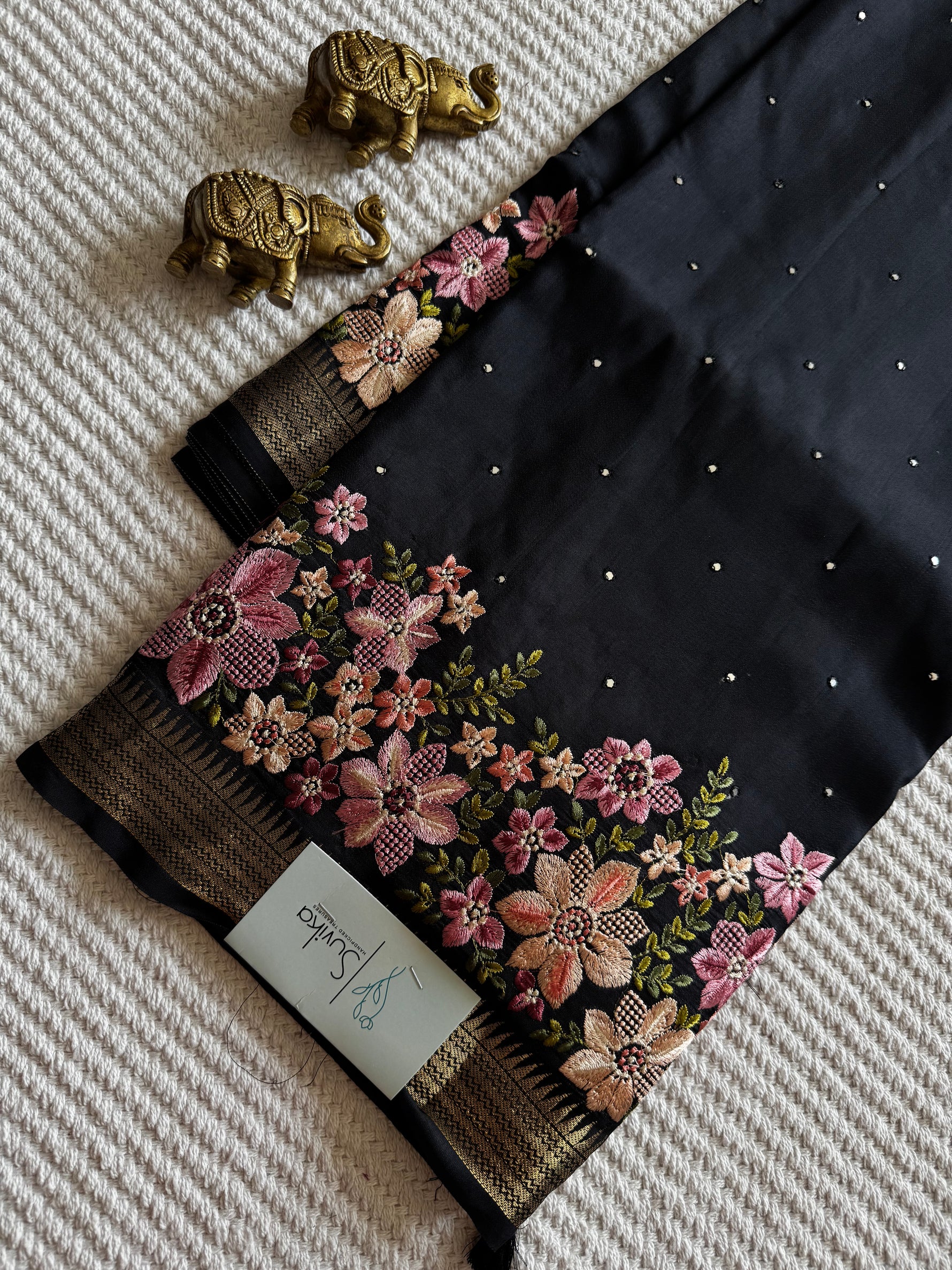 VISCOSE CREPE SILK SAREE WITH FLORAL EMBROIDERY BORDER AND MIRROR WORK ON THE BODY