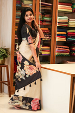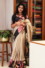 Beautiful Kathan banarasi weaving saree with Tusser printed floral border.